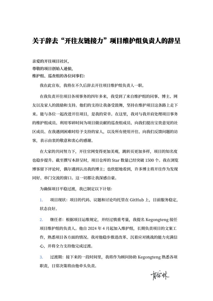 - 继任者:根据项目运维规定,并经过慎重考量,我提名 Kegongteng 接任项目维护组的负责人。他自 2024 年 4 月起加入维护组,长期负责项目的文案工作,熟悉项目各方面的情况。我对他稳步推进改革、沉着应对挑战的能力充满信心,并将全力支持他完成过渡。