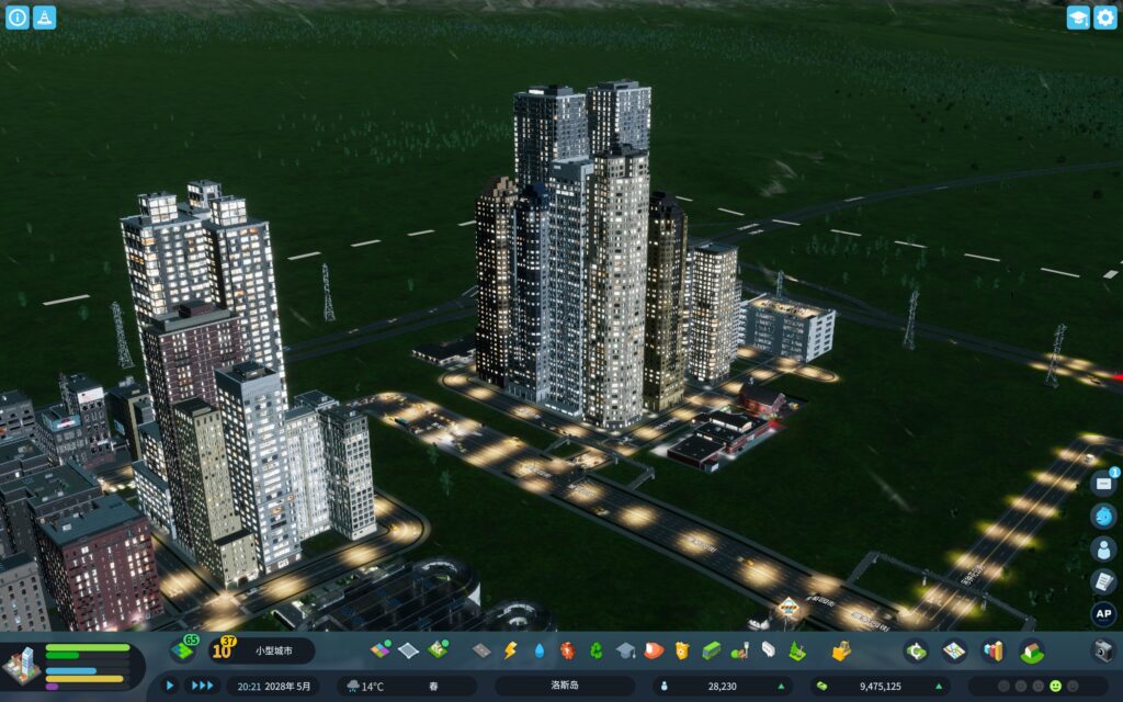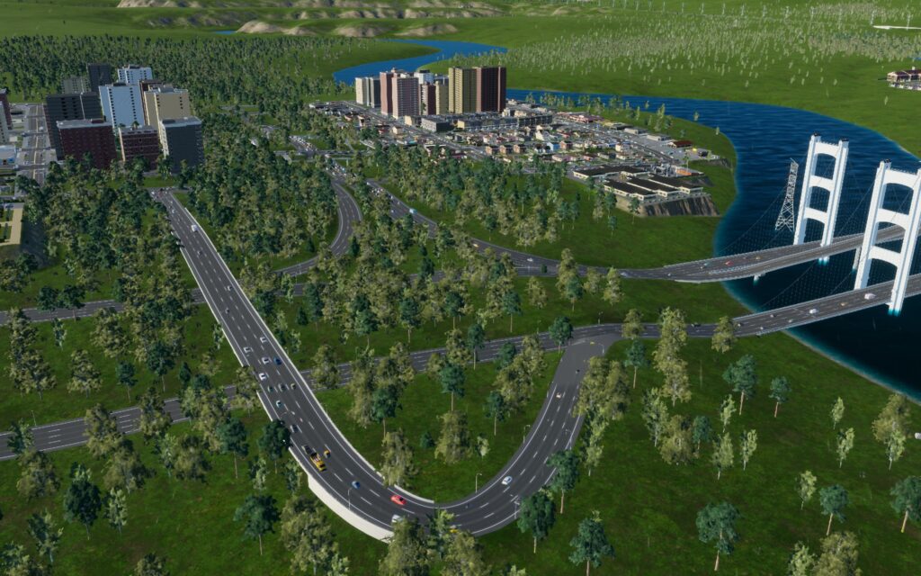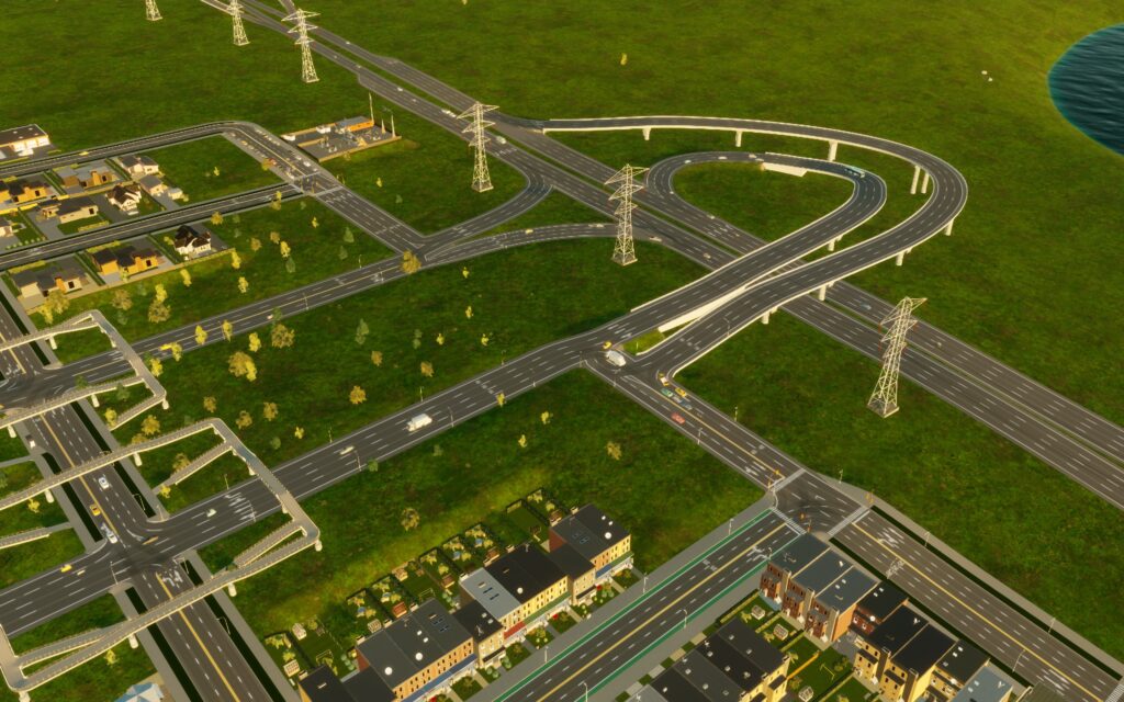 存档初期建立两个居民区和一个工业办公区,区与区之间用高速公路连接,区内部用双向四车道道路,居民上下高速通过区内部的高速主干道和立交桥。