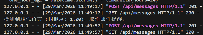 让 ai 完善了一下留言邮件提醒的逻辑,学生提交留言提醒之后会先在最近 24 小时的留言里匹配相似度,如果发现有相似度高于 0.85 的留言,则不会给老师发送邮件通知。