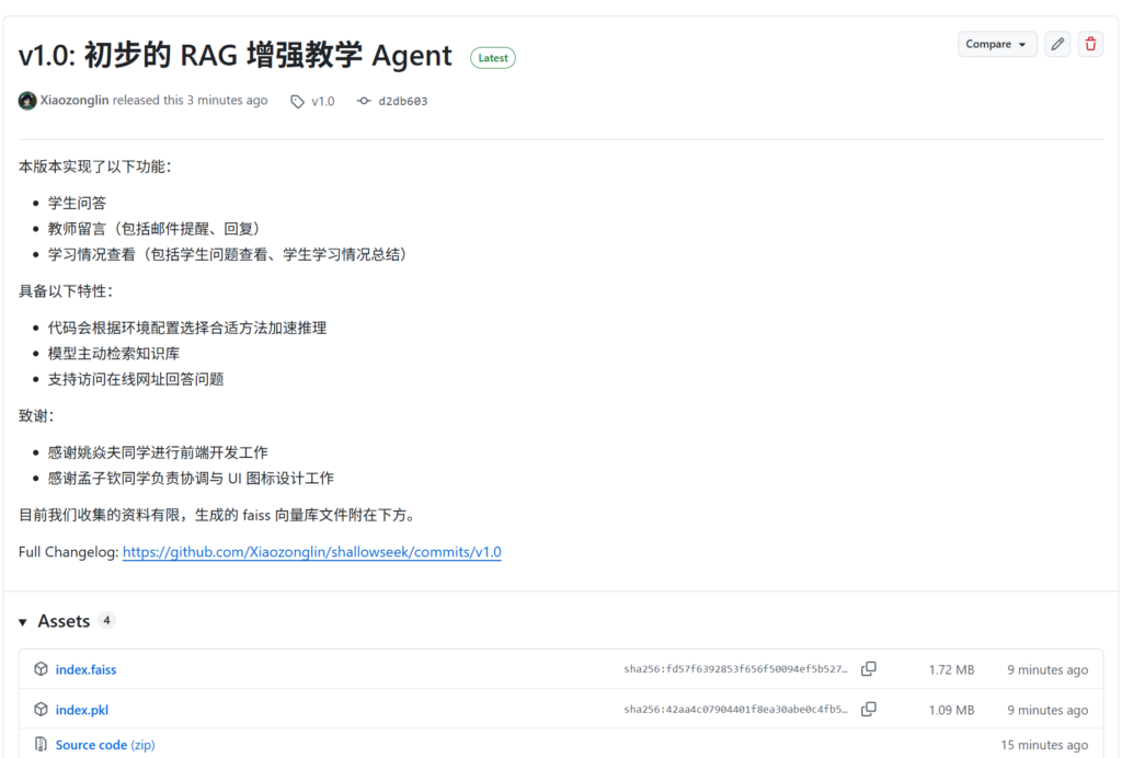 3 月 29 日晚上,在推完主动检索的修改之后,将新生成的向量知识库上传到 GitHub,发了一个版本。目前的开发任务差不多就完成了。