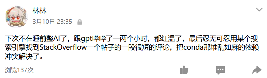 continue我在后端开发好之后让 ai 写了一份接口文档,供负责前端的姚同学阅读。原本以为 git 和前后端协作这方面会出现一些问题,结果并没有我想的那样困难。在帮忙装后端环境的时候出现了一个问题,关于 cuda 的问题: