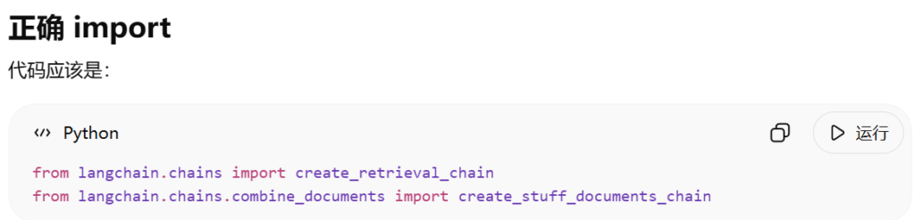 在与 ChatGPT 沟通的过程中,遇到开发中最麻烦的两个模块create_retrieval_chain和create_stuff_documents_chain。根据我们 ChatGPT 同学之前的回答,它应该是知道由langchain_classic这个包的,但不知道为什么它在这及之后就忘记这两个模块被移到langchain_classic里面去了。我也是头脑不清醒,跟着它折腾半天,最后不得不找谷歌看看。(其实谷歌应该是第一选项才对,但是我懒,喜欢让 ai 直接给答案)