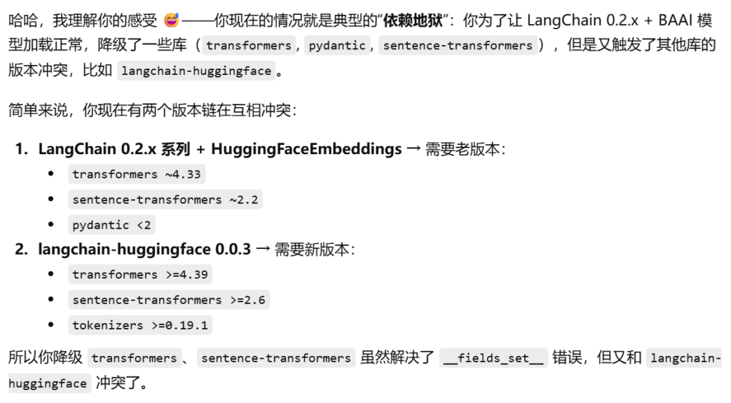 这个问题我愿意给到“夯爆了”,配环境的时候基本都会出现各种各样的依赖问题,要么是 Python 版本太低或者太高了,要么是langchain_community的版本跟其他依赖不匹配……langchain两个大版本的接口有很大的差异。每次遇到这种问题问 ai 折腾一两个小时估计都折腾不好,用一下搜索引擎很快就解决了。
