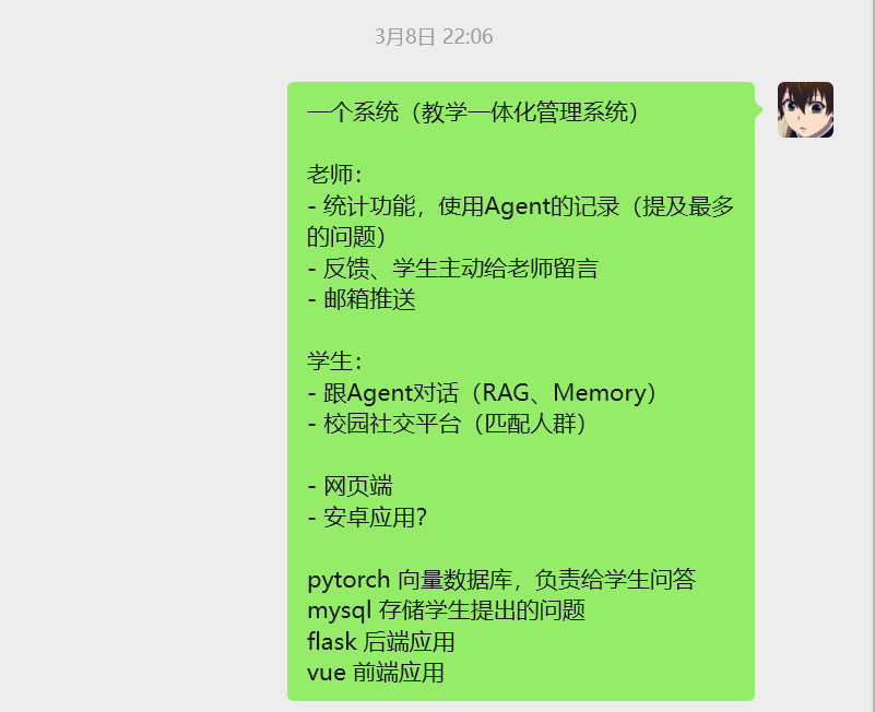 当天晚上,那位同学找我,我们和另外一位同学沟通一些想法,初步确定往“教-学-管-评”智能体方向去做,设计一个平台来服务教育教学。